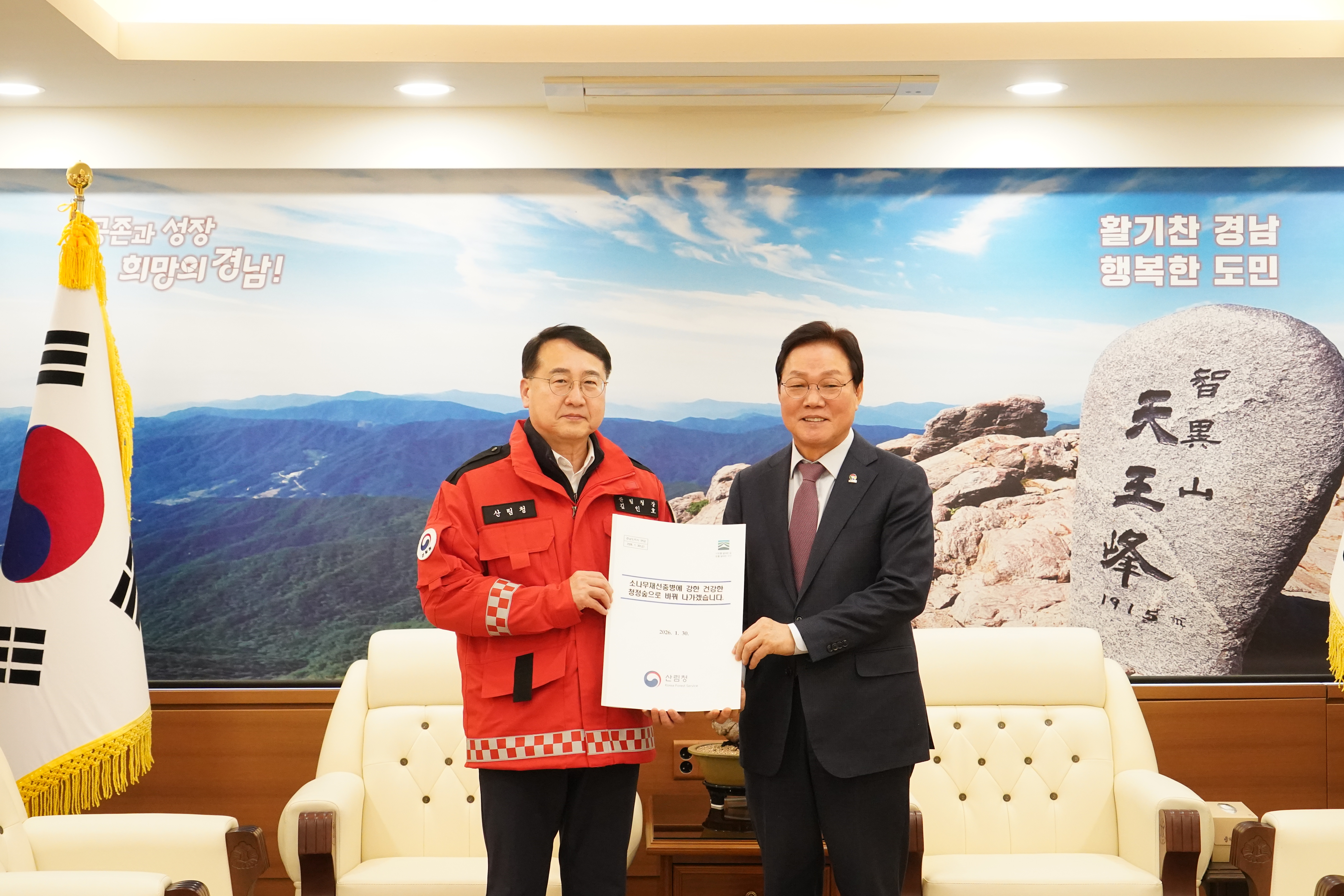 김인호 산림청장이 2026년 1월 30일 경남 창원시 경남도청을 방문, 박완수 경상남도지사와 산불, 소나무재선충병 방제 등 산림재난 대응 협력을 논의하고 있다.